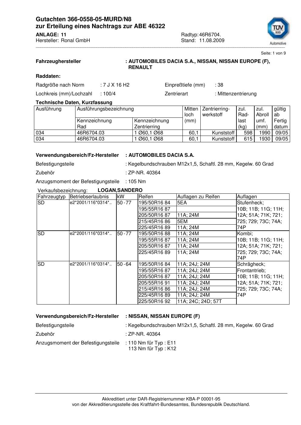 Dieses Gutachten (abe) bezieht sich auf die Alufelge Ronal 46R6704 in der Ausführung 7Jx16 ET 0, Mittenloch 0 mm (KBA 46322). Im PDF findest du typischerweise zulässige Reifengrößen, Auflagen/Anbauhinweise und – je nach Dokument – Hinweise zur Eintragung.