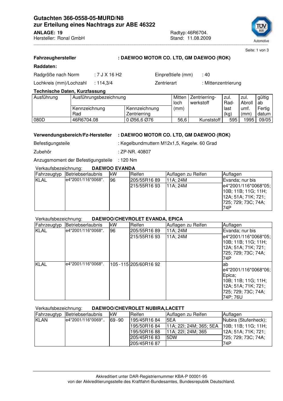 Dieses Gutachten (abe) bezieht sich auf die Alufelge Ronal 46R6704 in der Ausführung 7Jx16 ET 0, Mittenloch 0 mm (KBA 46322). Im PDF findest du typischerweise zulässige Reifengrößen, Auflagen/Anbauhinweise und – je nach Dokument – Hinweise zur Eintragung.