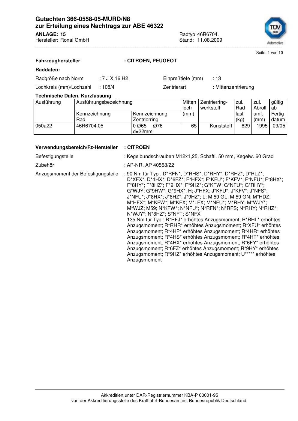 Dieses Gutachten (abe) bezieht sich auf die Alufelge Ronal 46R6704 in der Ausführung 7Jx16 ET 0, Mittenloch 0 mm (KBA 46322). Im PDF findest du typischerweise zulässige Reifengrößen, Auflagen/Anbauhinweise und – je nach Dokument – Hinweise zur Eintragung.