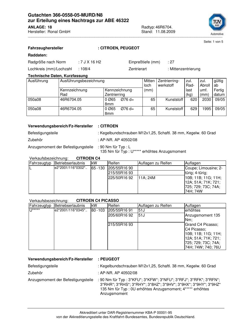 Dieses Gutachten (abe) bezieht sich auf die Alufelge Ronal 46R6704 in der Ausführung 7Jx16 ET 0, Mittenloch 0 mm (KBA 46322). Im PDF findest du typischerweise zulässige Reifengrößen, Auflagen/Anbauhinweise und – je nach Dokument – Hinweise zur Eintragung.