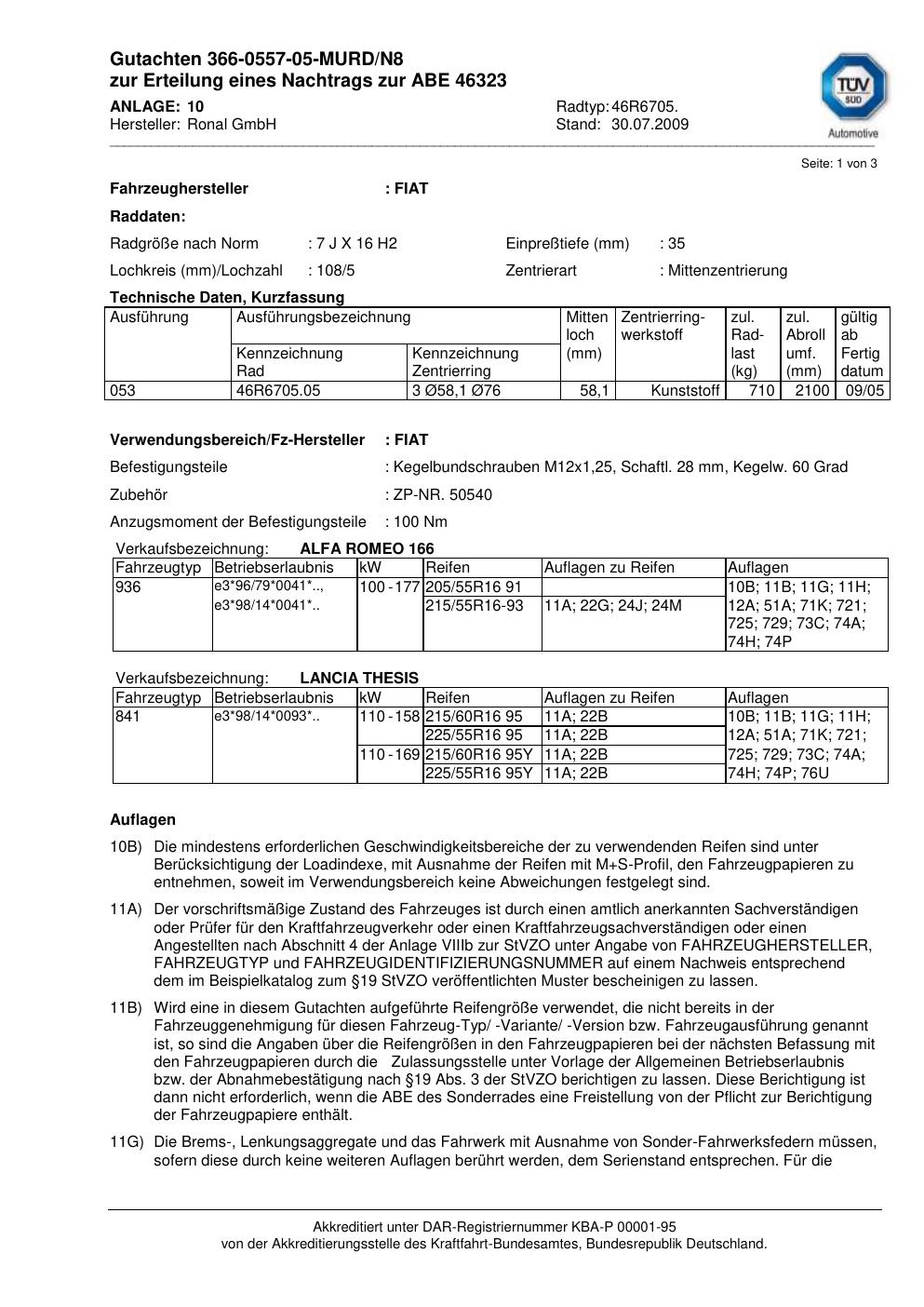 Dieses Gutachten (abe) bezieht sich auf die Alufelge Ronal 46R6705 in der Ausführung 7Jx16 ET 0, Mittenloch 0 mm (KBA 46323). Im PDF findest du typischerweise zulässige Reifengrößen, Auflagen/Anbauhinweise und – je nach Dokument – Hinweise zur Eintragung.
