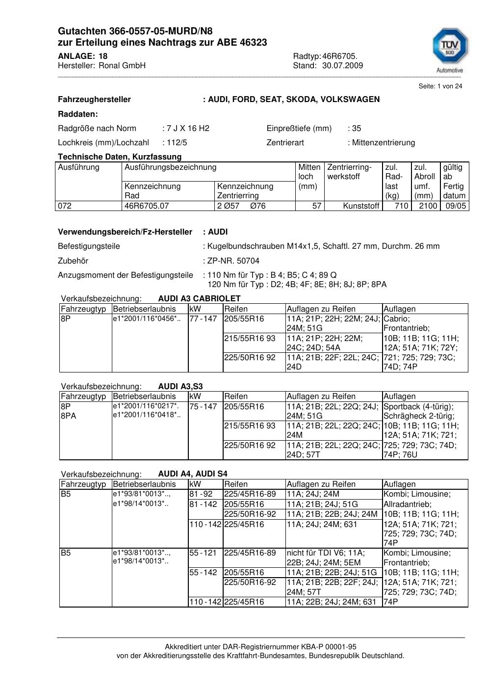 Dieses Gutachten (abe) bezieht sich auf die Alufelge Ronal 46R6705 in der Ausführung 7Jx16 ET 0, Mittenloch 0 mm (KBA 46323). Im PDF findest du typischerweise zulässige Reifengrößen, Auflagen/Anbauhinweise und – je nach Dokument – Hinweise zur Eintragung.