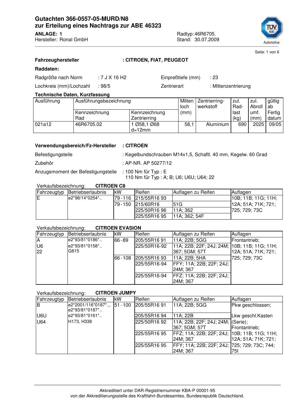 Dieses Gutachten (abe) bezieht sich auf die Alufelge Ronal 46R6705 in der Ausführung 7Jx16 ET 0, Mittenloch 0 mm (KBA 46323). Im PDF findest du typischerweise zulässige Reifengrößen, Auflagen/Anbauhinweise und – je nach Dokument – Hinweise zur Eintragung.