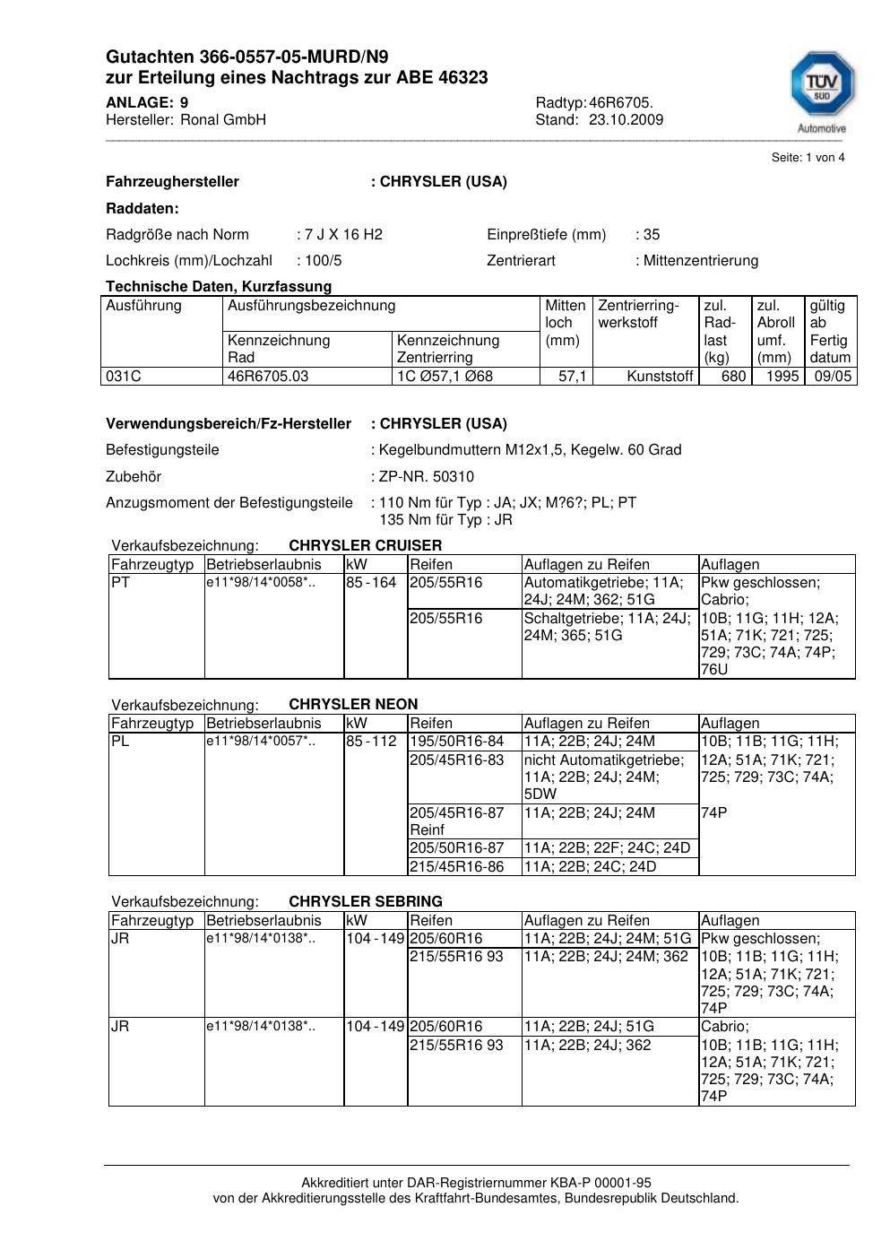 Dieses Gutachten (abe) bezieht sich auf die Alufelge Ronal 46R6705 in der Ausführung 7Jx16 ET 0, Mittenloch 0 mm (KBA 46323). Im PDF findest du typischerweise zulässige Reifengrößen, Auflagen/Anbauhinweise und – je nach Dokument – Hinweise zur Eintragung.
