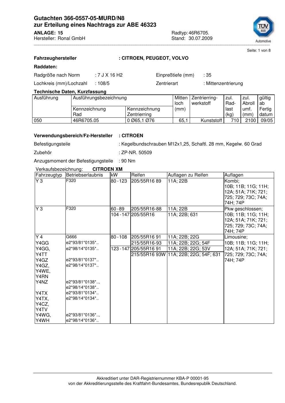 Dieses Gutachten (abe) bezieht sich auf die Alufelge Ronal 46R6705 in der Ausführung 7Jx16 ET 0, Mittenloch 0 mm (KBA 46323). Im PDF findest du typischerweise zulässige Reifengrößen, Auflagen/Anbauhinweise und – je nach Dokument – Hinweise zur Eintragung.