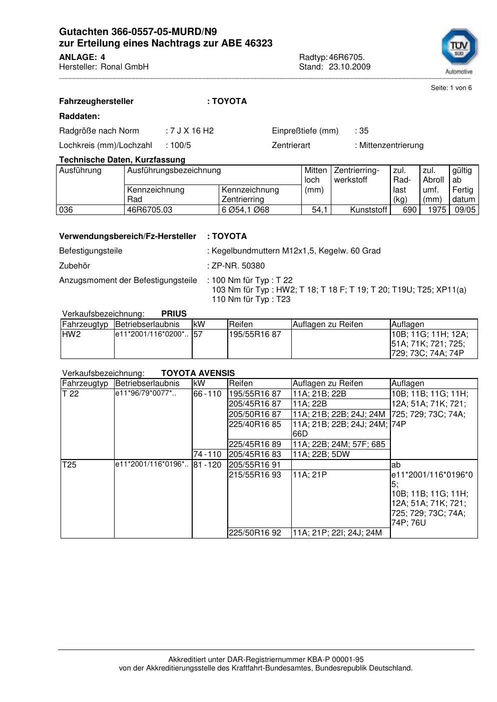 Dieses Gutachten (abe) bezieht sich auf die Alufelge Ronal 46R6705 in der Ausführung 7Jx16 ET 0, Mittenloch 0 mm (KBA 46323). Im PDF findest du typischerweise zulässige Reifengrößen, Auflagen/Anbauhinweise und – je nach Dokument – Hinweise zur Eintragung.