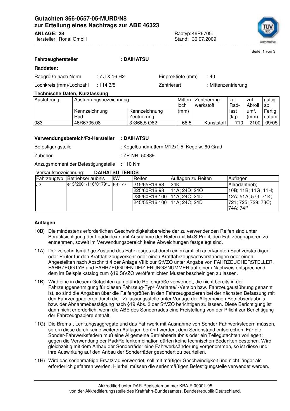 Dieses Gutachten (abe) bezieht sich auf die Alufelge Ronal 46R6705 in der Ausführung 7Jx16 ET 0, Mittenloch 0 mm (KBA 46323). Im PDF findest du typischerweise zulässige Reifengrößen, Auflagen/Anbauhinweise und – je nach Dokument – Hinweise zur Eintragung.