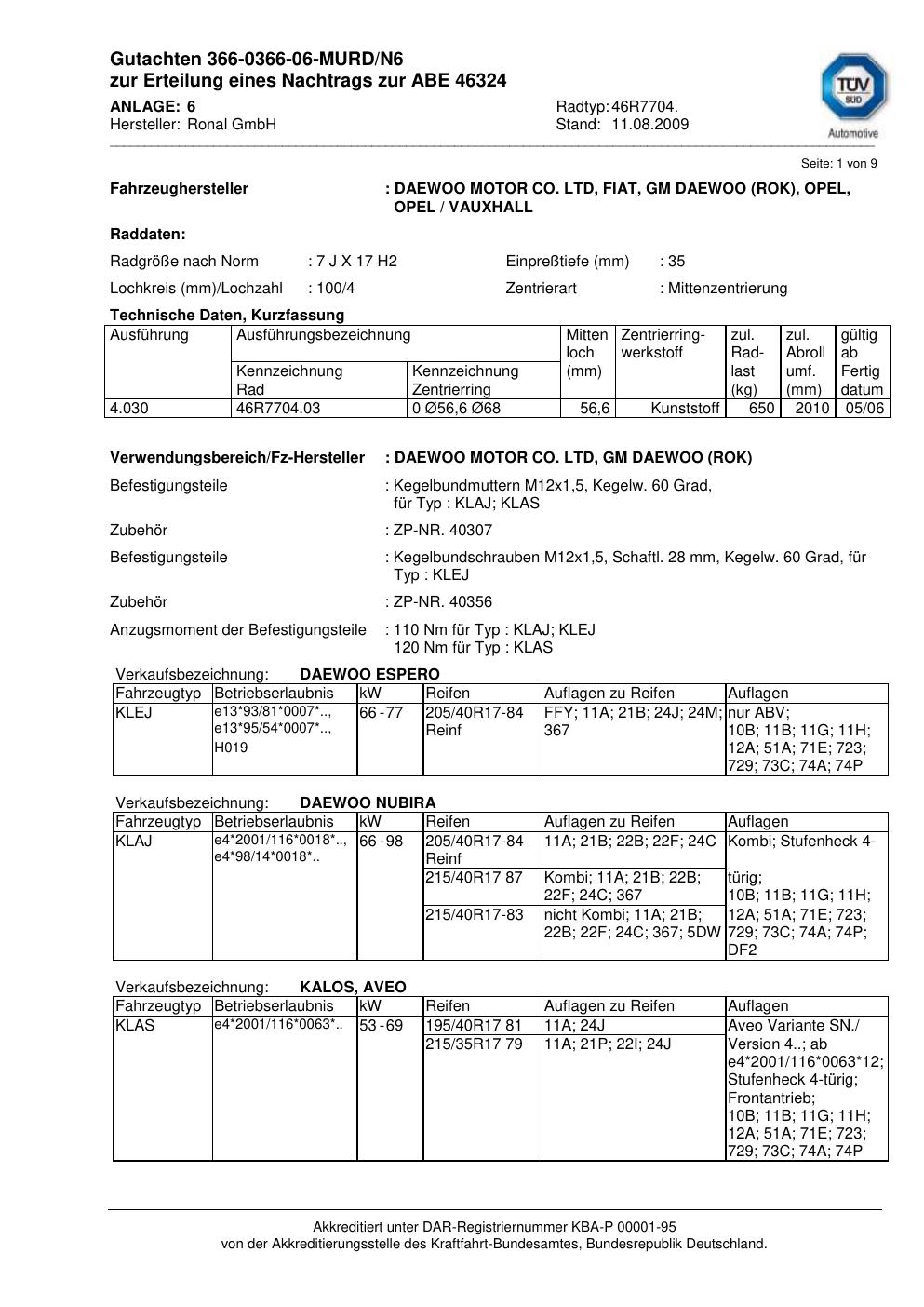 Dieses Gutachten (abe) bezieht sich auf die Alufelge Ronal 46R7704 in der Ausführung 7Jx17 ET 0, Mittenloch 0 mm (KBA 46324). Im PDF findest du typischerweise zulässige Reifengrößen, Auflagen/Anbauhinweise und – je nach Dokument – Hinweise zur Eintragung.