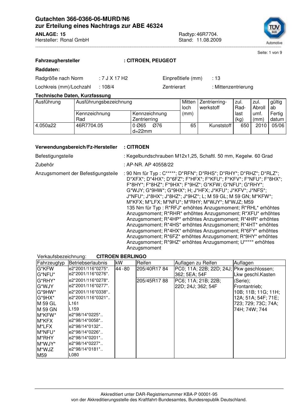 Dieses Gutachten (abe) bezieht sich auf die Alufelge Ronal 46R7704 in der Ausführung 7Jx17 ET 0, Mittenloch 0 mm (KBA 46324). Im PDF findest du typischerweise zulässige Reifengrößen, Auflagen/Anbauhinweise und – je nach Dokument – Hinweise zur Eintragung.
