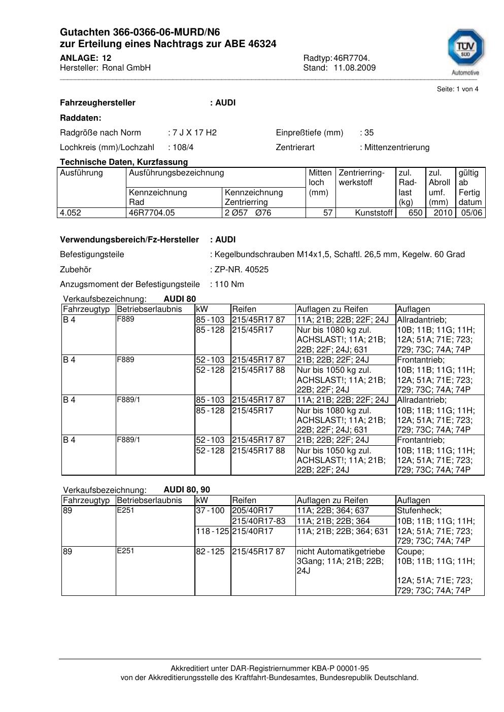 Dieses Gutachten (abe) bezieht sich auf die Alufelge Ronal 46R7704 in der Ausführung 7Jx17 ET 0, Mittenloch 0 mm (KBA 46324). Im PDF findest du typischerweise zulässige Reifengrößen, Auflagen/Anbauhinweise und – je nach Dokument – Hinweise zur Eintragung.