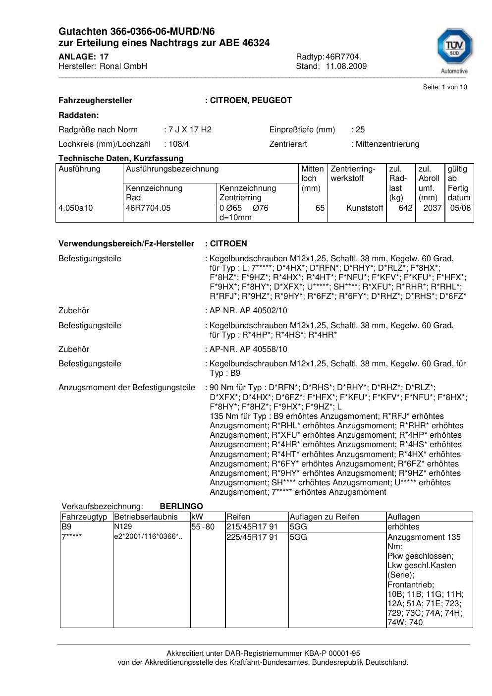 Dieses Gutachten (abe) bezieht sich auf die Alufelge Ronal 46R7704 in der Ausführung 7Jx17 ET 0, Mittenloch 0 mm (KBA 46324). Im PDF findest du typischerweise zulässige Reifengrößen, Auflagen/Anbauhinweise und – je nach Dokument – Hinweise zur Eintragung.