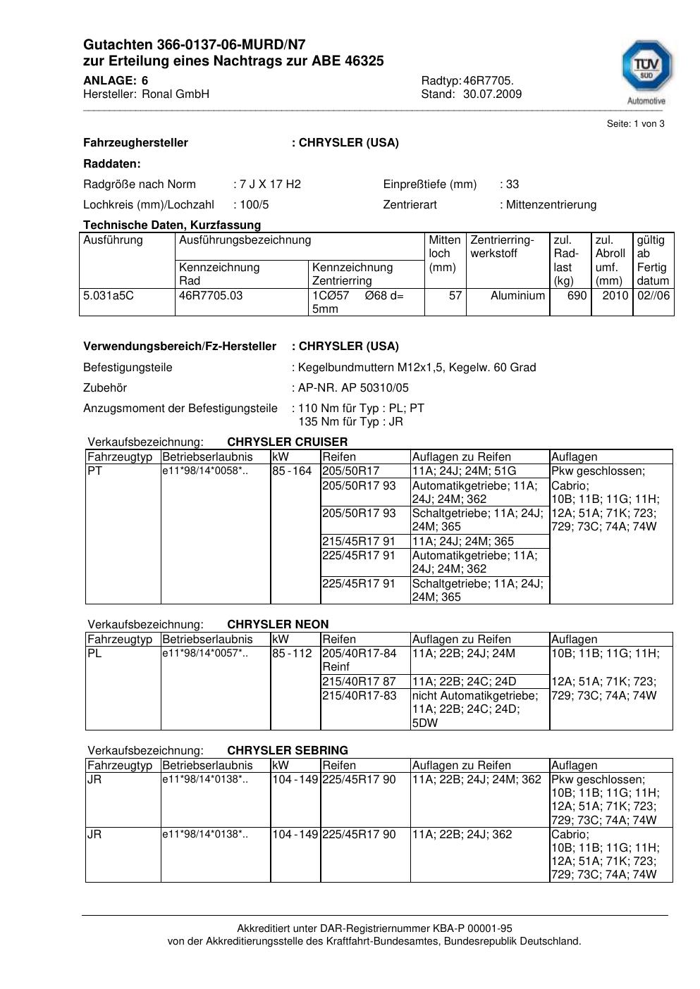 Dieses Gutachten (abe) bezieht sich auf die Alufelge Ronal 46R7705 in der Ausführung 7Jx17 ET 0, Mittenloch 0 mm (KBA 46325). Im PDF findest du typischerweise zulässige Reifengrößen, Auflagen/Anbauhinweise und – je nach Dokument – Hinweise zur Eintragung.