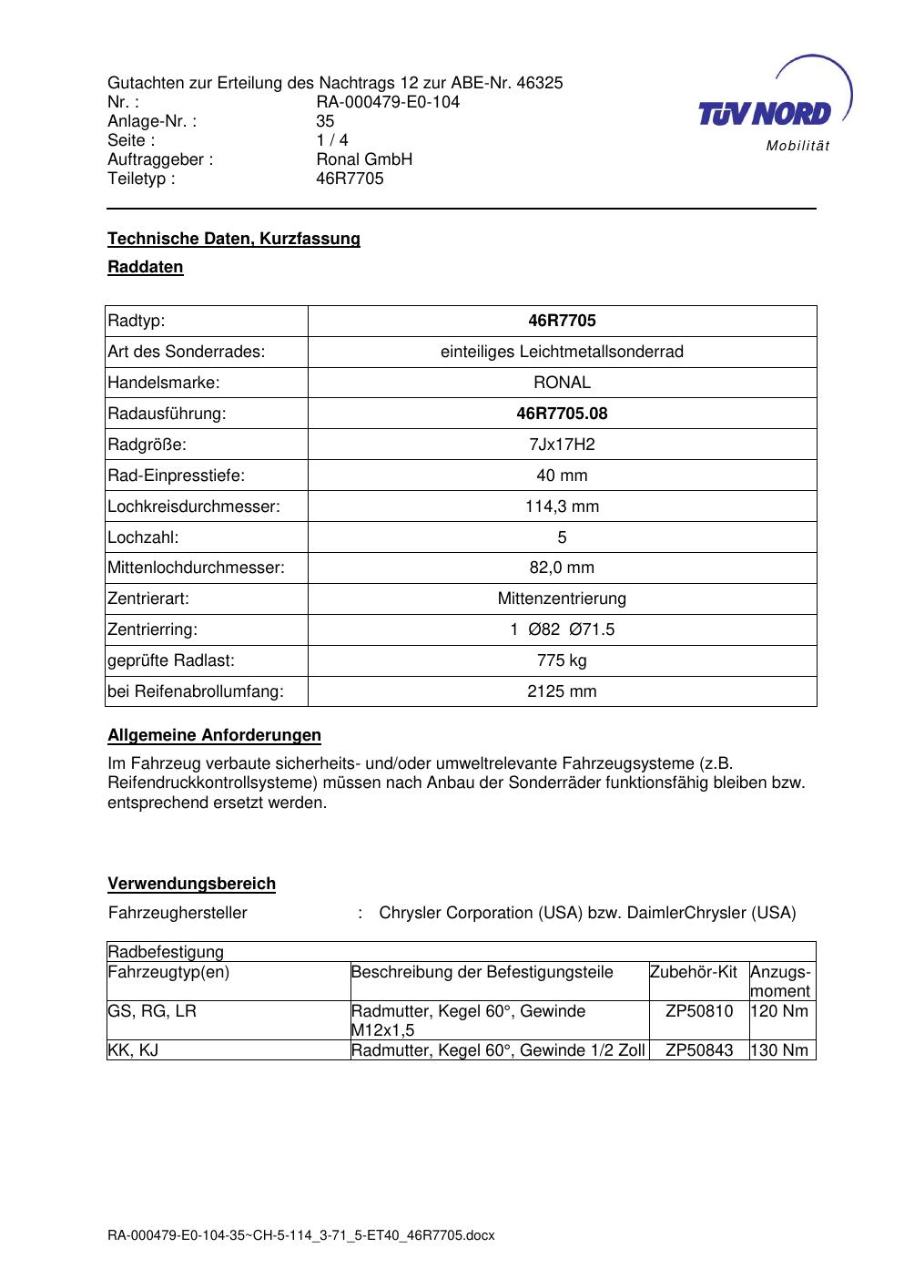 Dieses Gutachten (abe) bezieht sich auf die Alufelge Ronal 46R7705 in der Ausführung 7Jx17 ET 0, Mittenloch 0 mm (KBA 46325). Im PDF findest du typischerweise zulässige Reifengrößen, Auflagen/Anbauhinweise und – je nach Dokument – Hinweise zur Eintragung.