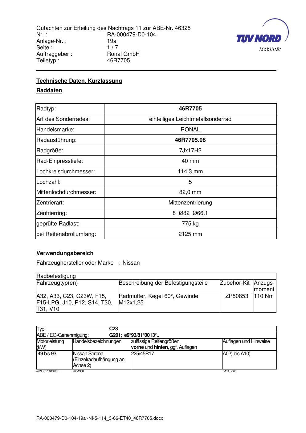 Dieses Gutachten (abe) bezieht sich auf die Alufelge Ronal 46R7705 in der Ausführung 7Jx17 ET 0, Mittenloch 0 mm (KBA 46325). Im PDF findest du typischerweise zulässige Reifengrößen, Auflagen/Anbauhinweise und – je nach Dokument – Hinweise zur Eintragung.