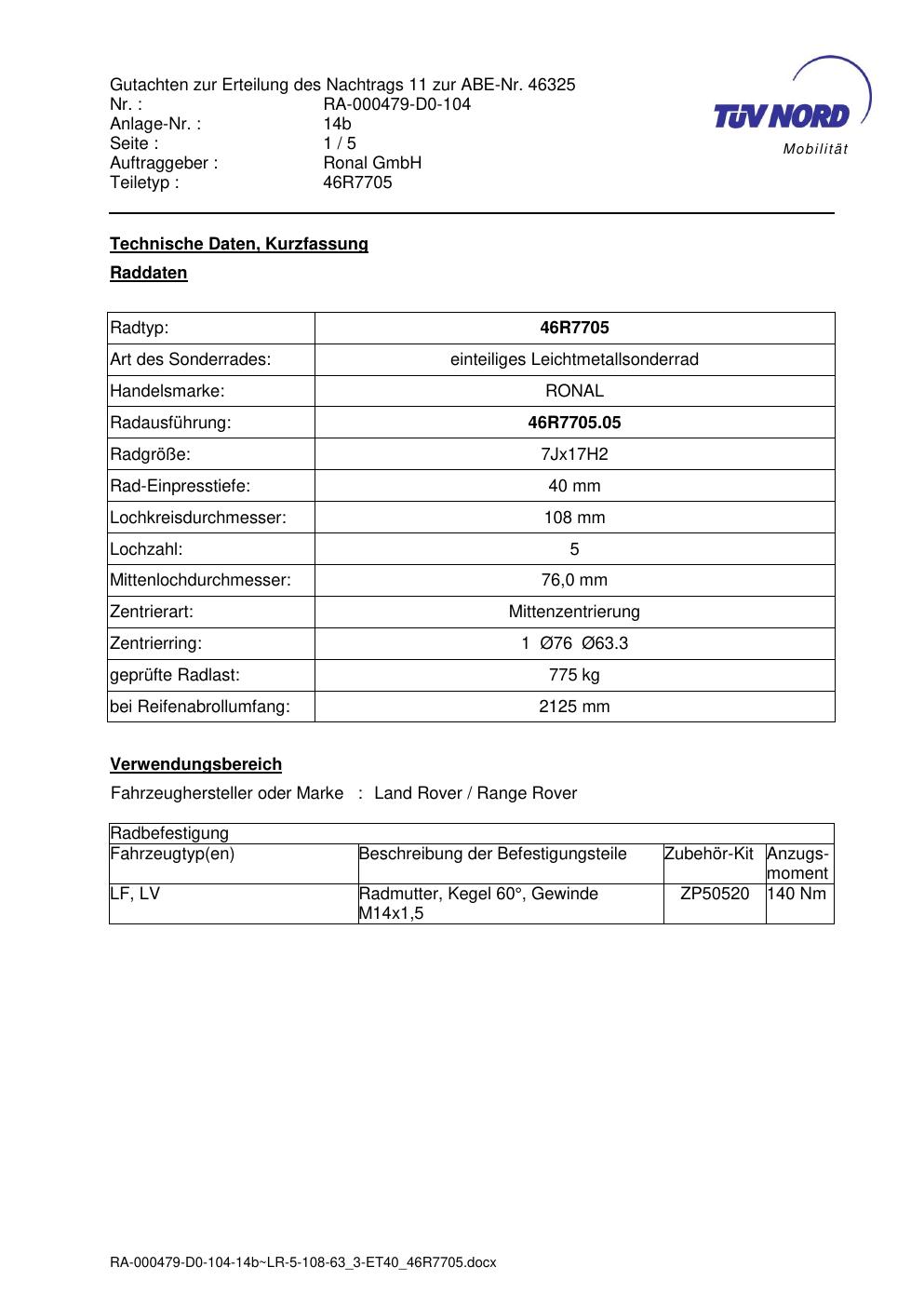 Dieses Gutachten (abe) bezieht sich auf die Alufelge Ronal 46R7705 in der Ausführung 7Jx17 ET 0, Mittenloch 0 mm (KBA 46325). Im PDF findest du typischerweise zulässige Reifengrößen, Auflagen/Anbauhinweise und – je nach Dokument – Hinweise zur Eintragung.