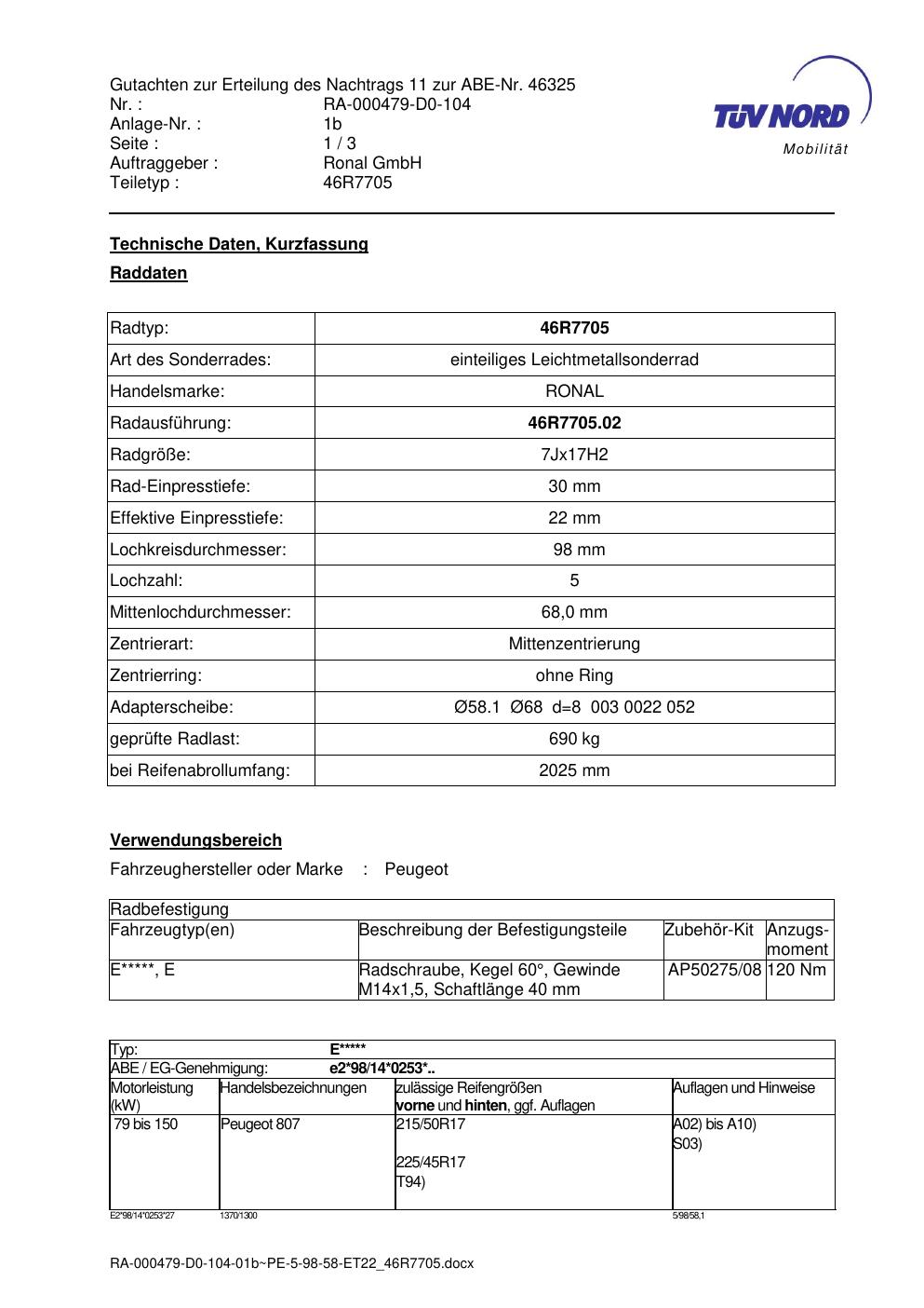 Dieses Gutachten (abe) bezieht sich auf die Alufelge Ronal 46R7705 in der Ausführung 7Jx17 ET 0, Mittenloch 0 mm (KBA 46325). Im PDF findest du typischerweise zulässige Reifengrößen, Auflagen/Anbauhinweise und – je nach Dokument – Hinweise zur Eintragung.