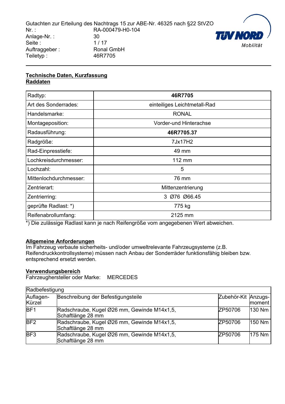 Dieses Gutachten (abe) bezieht sich auf die Alufelge Ronal 46R7705 in der Ausführung 7Jx17 ET 0, Mittenloch 0 mm (KBA 46325). Im PDF findest du typischerweise zulässige Reifengrößen, Auflagen/Anbauhinweise und – je nach Dokument – Hinweise zur Eintragung.