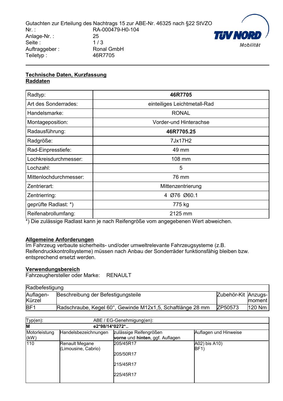Dieses Gutachten (abe) bezieht sich auf die Alufelge Ronal 46R7705 in der Ausführung 7Jx17 ET 0, Mittenloch 0 mm (KBA 46325). Im PDF findest du typischerweise zulässige Reifengrößen, Auflagen/Anbauhinweise und – je nach Dokument – Hinweise zur Eintragung.