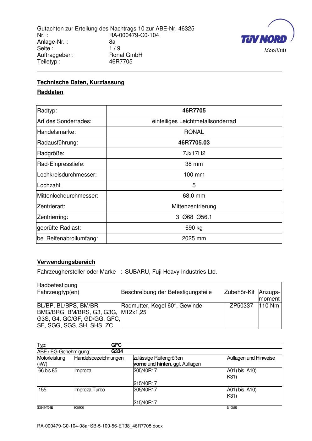 Dieses Gutachten (abe) bezieht sich auf die Alufelge Ronal 46R7705 in der Ausführung 7Jx17 ET 0, Mittenloch 0 mm (KBA 46325). Im PDF findest du typischerweise zulässige Reifengrößen, Auflagen/Anbauhinweise und – je nach Dokument – Hinweise zur Eintragung.