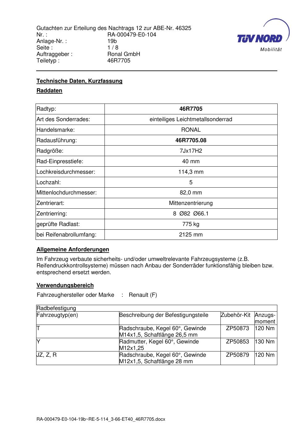 Dieses Gutachten (abe) bezieht sich auf die Alufelge Ronal 46R7705 in der Ausführung 7Jx17 ET 0, Mittenloch 0 mm (KBA 46325). Im PDF findest du typischerweise zulässige Reifengrößen, Auflagen/Anbauhinweise und – je nach Dokument – Hinweise zur Eintragung.