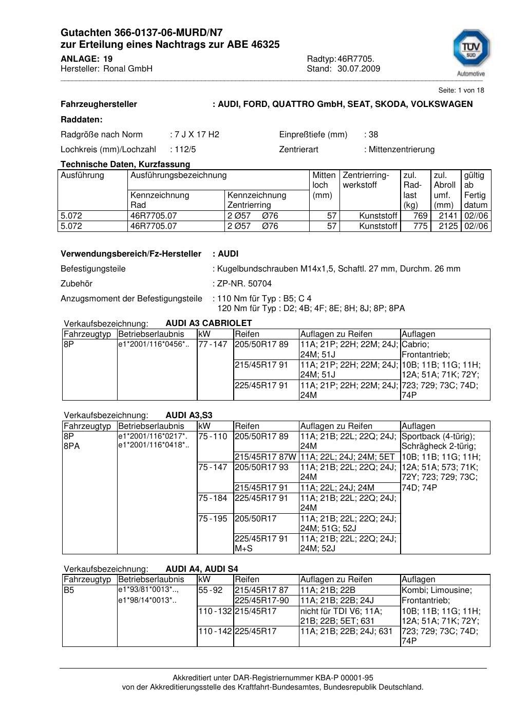 Dieses Gutachten (abe) bezieht sich auf die Alufelge Ronal 46R7705 in der Ausführung 7Jx17 ET 0, Mittenloch 0 mm (KBA 46325). Im PDF findest du typischerweise zulässige Reifengrößen, Auflagen/Anbauhinweise und – je nach Dokument – Hinweise zur Eintragung.