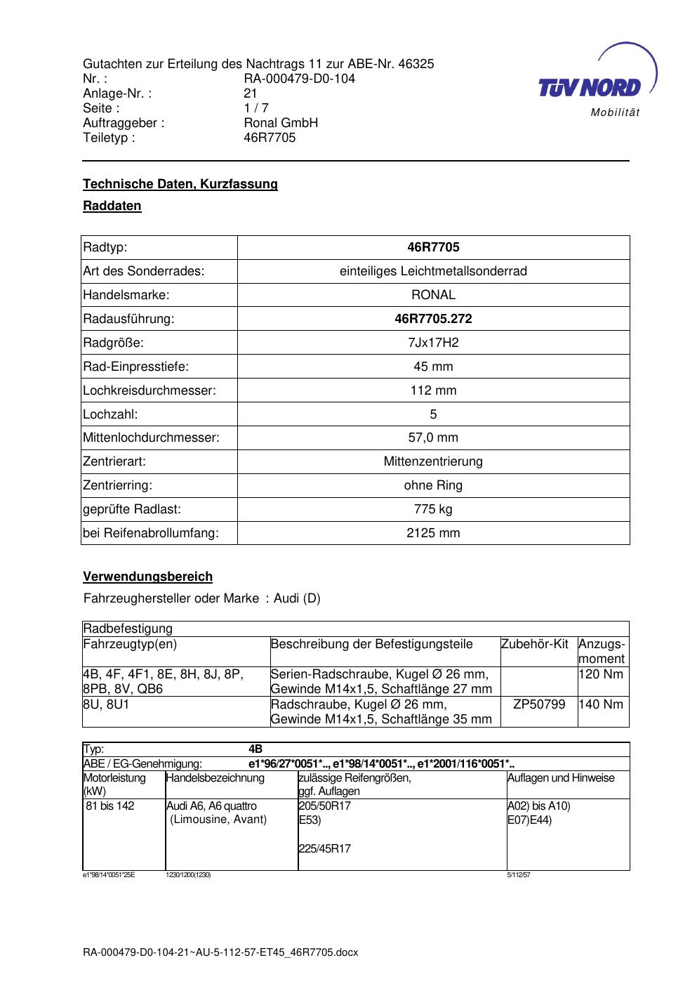 Dieses Gutachten (abe) bezieht sich auf die Alufelge Ronal 46R7705 in der Ausführung 7Jx17 ET 0, Mittenloch 0 mm (KBA 46325). Im PDF findest du typischerweise zulässige Reifengrößen, Auflagen/Anbauhinweise und – je nach Dokument – Hinweise zur Eintragung.