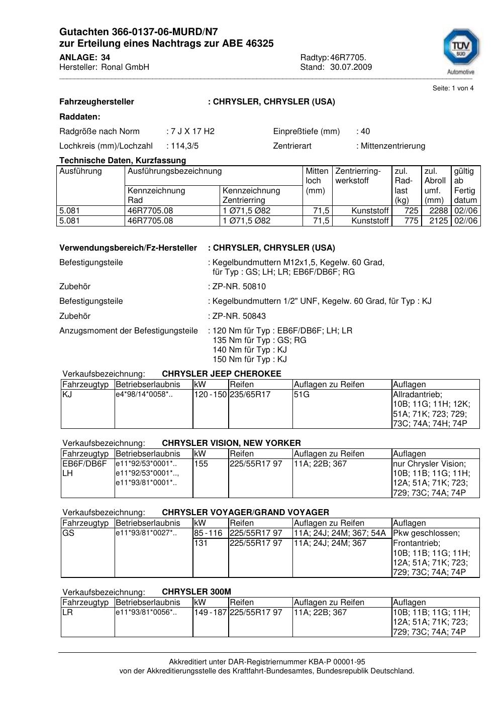 Dieses Gutachten (abe) bezieht sich auf die Alufelge Ronal 46R7705 in der Ausführung 7Jx17 ET 0, Mittenloch 0 mm (KBA 46325). Im PDF findest du typischerweise zulässige Reifengrößen, Auflagen/Anbauhinweise und – je nach Dokument – Hinweise zur Eintragung.