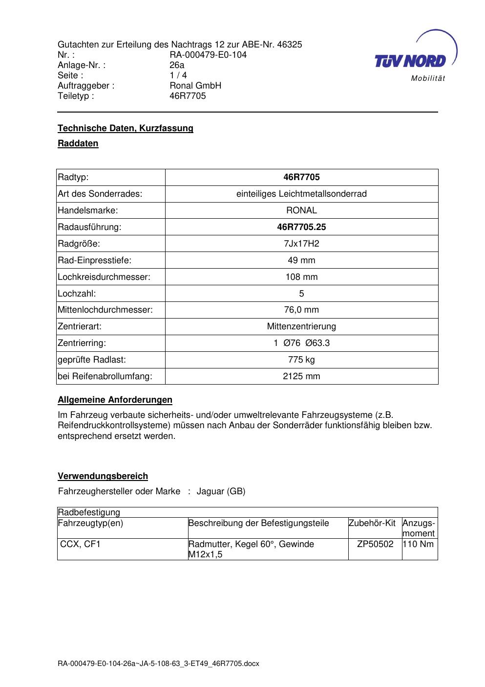 Dieses Gutachten (abe) bezieht sich auf die Alufelge Ronal 46R7705 in der Ausführung 7Jx17 ET 0, Mittenloch 0 mm (KBA 46325). Im PDF findest du typischerweise zulässige Reifengrößen, Auflagen/Anbauhinweise und – je nach Dokument – Hinweise zur Eintragung.