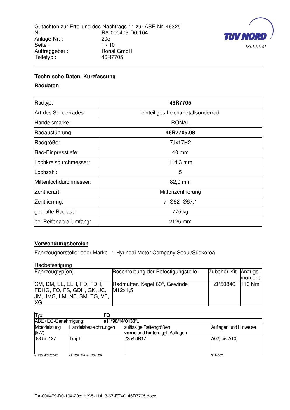 Dieses Gutachten (abe) bezieht sich auf die Alufelge Ronal 46R7705 in der Ausführung 7Jx17 ET 0, Mittenloch 0 mm (KBA 46325). Im PDF findest du typischerweise zulässige Reifengrößen, Auflagen/Anbauhinweise und – je nach Dokument – Hinweise zur Eintragung.