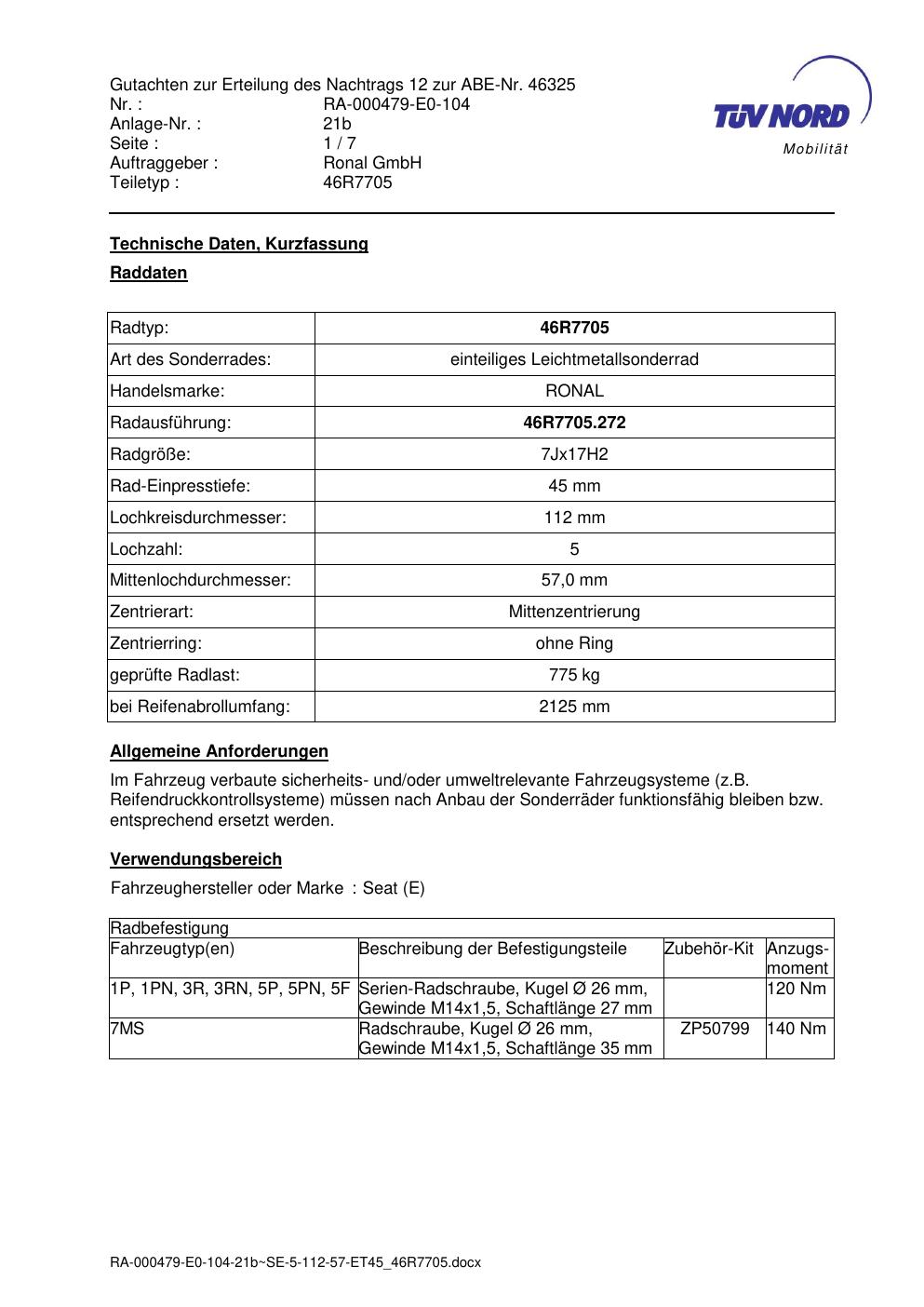 Dieses Gutachten (abe) bezieht sich auf die Alufelge Ronal 46R7705 in der Ausführung 7Jx17 ET 0, Mittenloch 0 mm (KBA 46325). Im PDF findest du typischerweise zulässige Reifengrößen, Auflagen/Anbauhinweise und – je nach Dokument – Hinweise zur Eintragung.