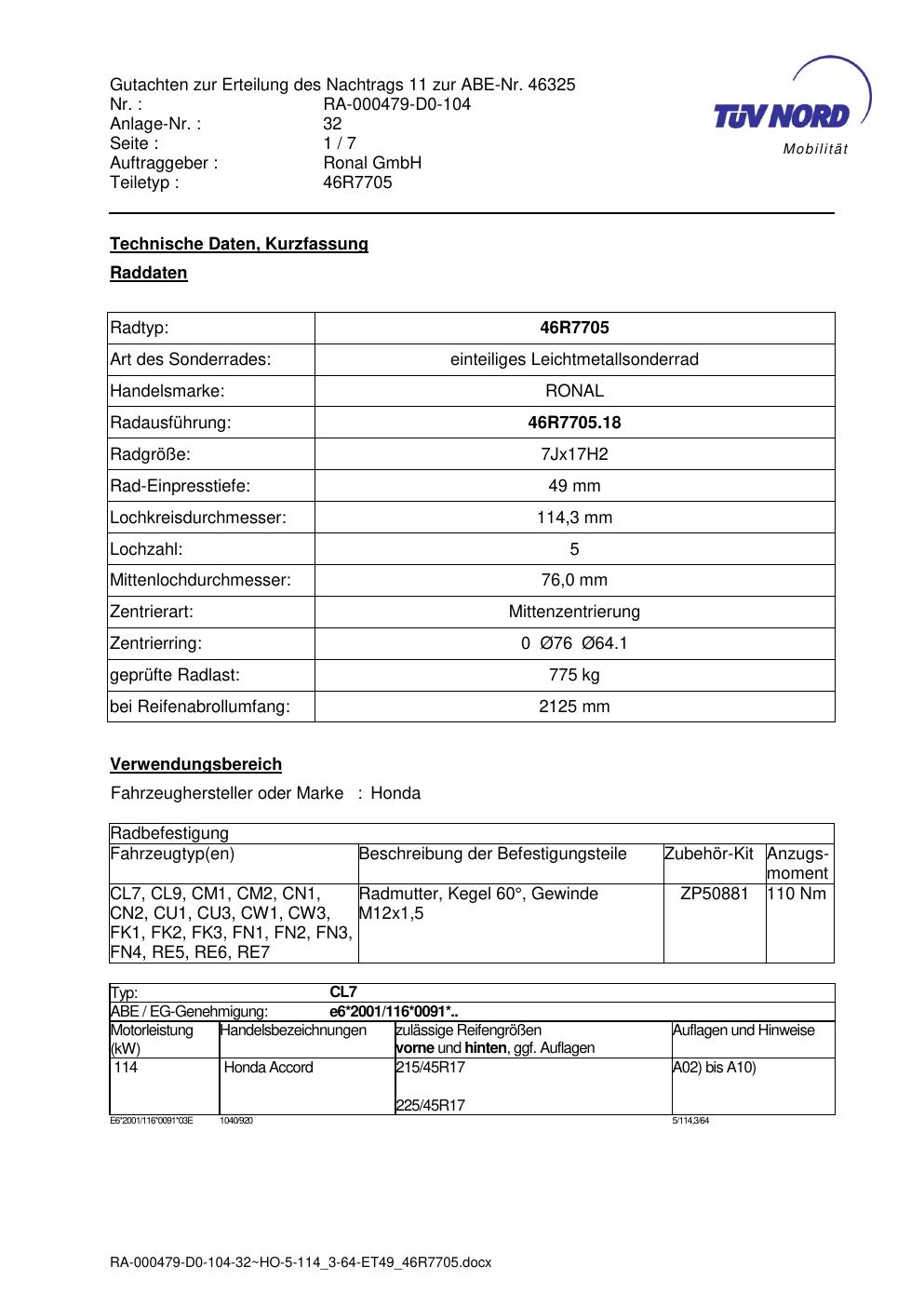 Dieses Gutachten (abe) bezieht sich auf die Alufelge Ronal 46R7705 in der Ausführung 7Jx17 ET 0, Mittenloch 0 mm (KBA 46325). Im PDF findest du typischerweise zulässige Reifengrößen, Auflagen/Anbauhinweise und – je nach Dokument – Hinweise zur Eintragung.