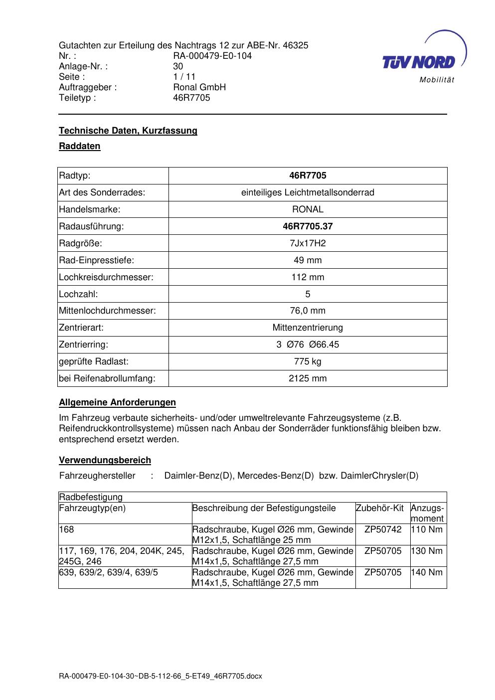 Dieses Gutachten (abe) bezieht sich auf die Alufelge Ronal 46R7705 in der Ausführung 7Jx17 ET 0, Mittenloch 0 mm (KBA 46325). Im PDF findest du typischerweise zulässige Reifengrößen, Auflagen/Anbauhinweise und – je nach Dokument – Hinweise zur Eintragung.