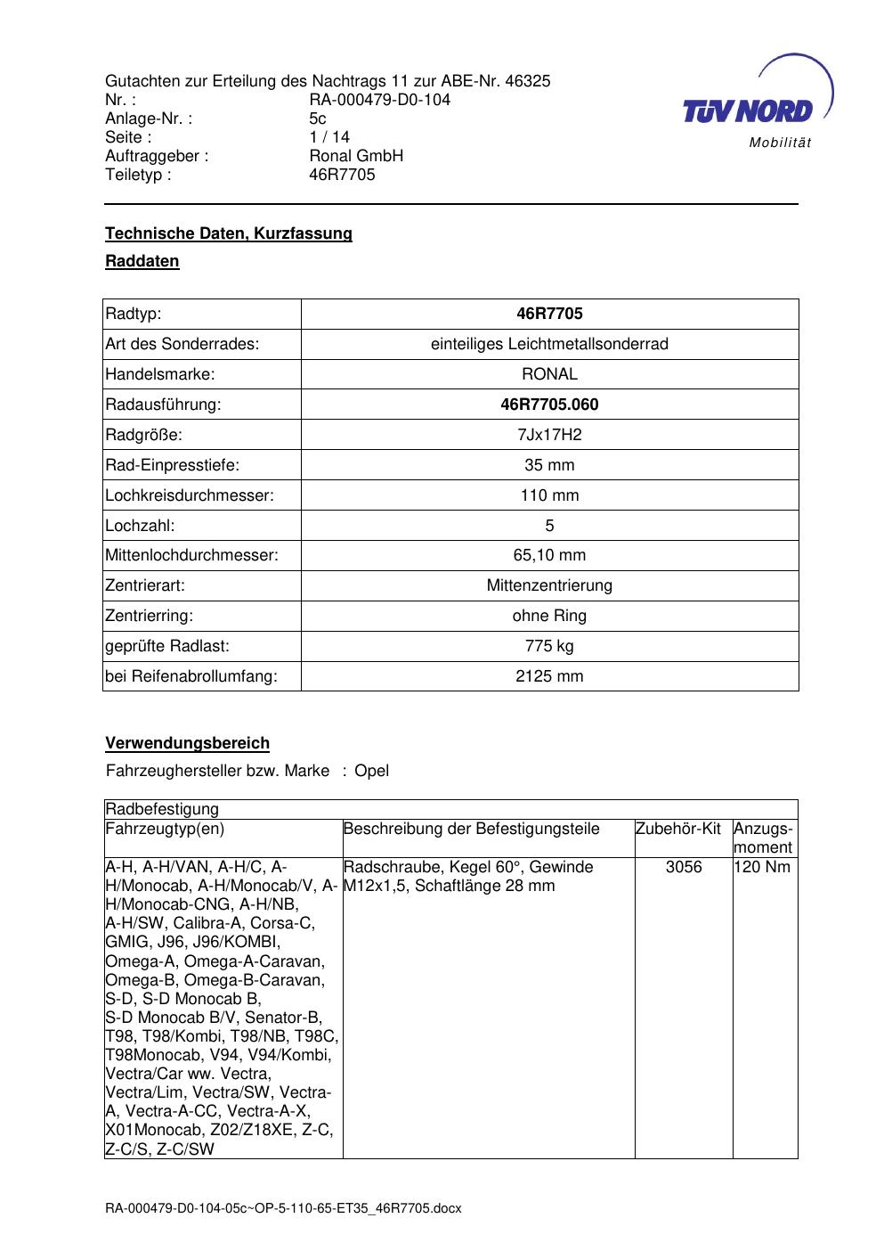 Dieses Gutachten (abe) bezieht sich auf die Alufelge Ronal 46R7705 in der Ausführung 7Jx17 ET 0, Mittenloch 0 mm (KBA 46325). Im PDF findest du typischerweise zulässige Reifengrößen, Auflagen/Anbauhinweise und – je nach Dokument – Hinweise zur Eintragung.