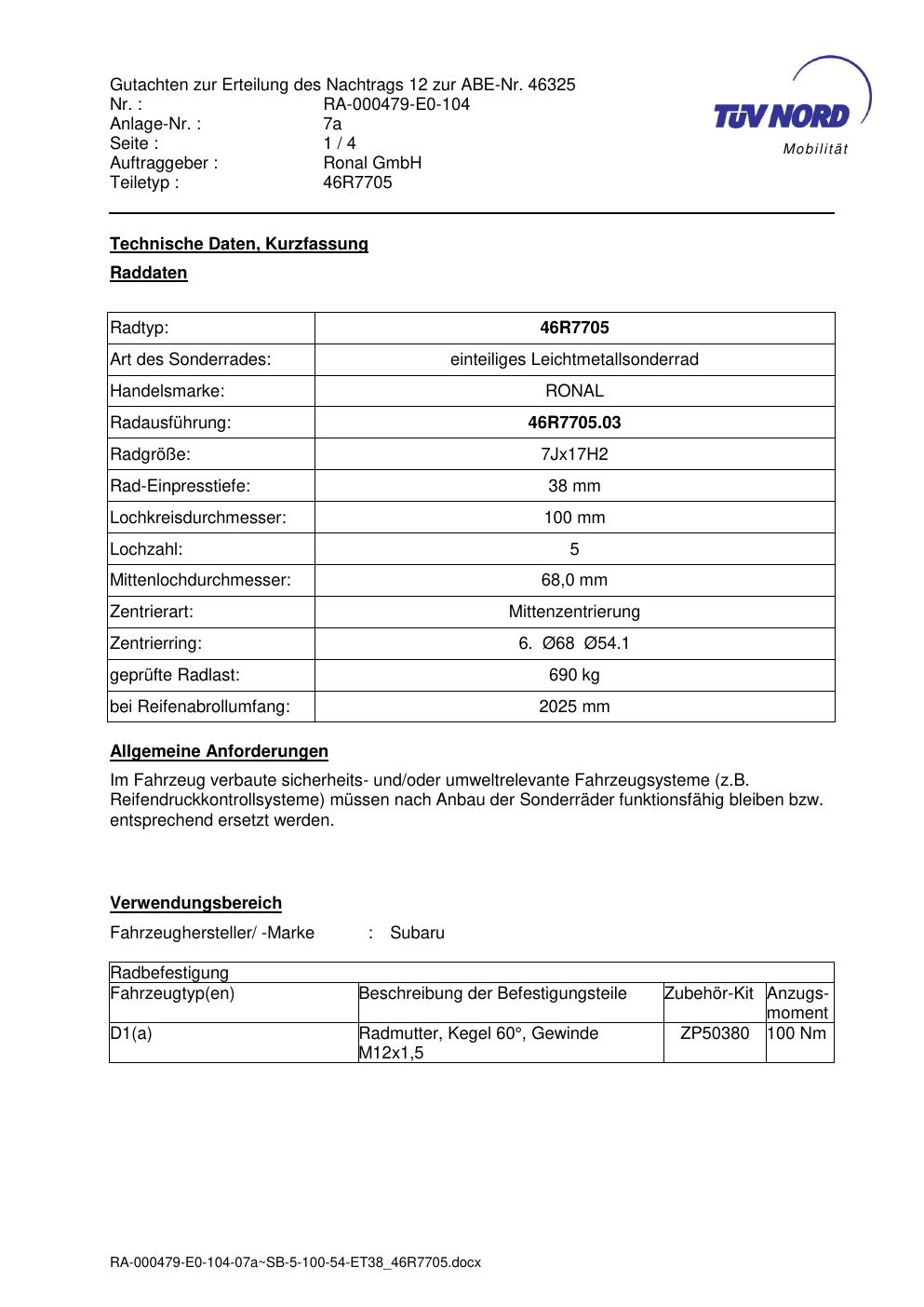 Dieses Gutachten (abe) bezieht sich auf die Alufelge Ronal 46R7705 in der Ausführung 7Jx17 ET 0, Mittenloch 0 mm (KBA 46325). Im PDF findest du typischerweise zulässige Reifengrößen, Auflagen/Anbauhinweise und – je nach Dokument – Hinweise zur Eintragung.