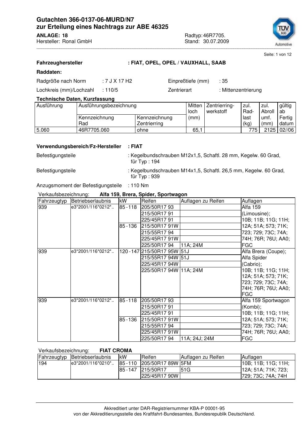 Dieses Gutachten (abe) bezieht sich auf die Alufelge Ronal 46R7705 in der Ausführung 7Jx17 ET 0, Mittenloch 0 mm (KBA 46325). Im PDF findest du typischerweise zulässige Reifengrößen, Auflagen/Anbauhinweise und – je nach Dokument – Hinweise zur Eintragung.
