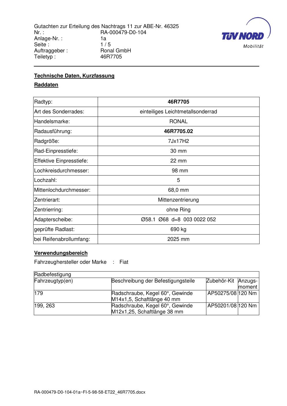 Dieses Gutachten (abe) bezieht sich auf die Alufelge Ronal 46R7705 in der Ausführung 7Jx17 ET 0, Mittenloch 0 mm (KBA 46325). Im PDF findest du typischerweise zulässige Reifengrößen, Auflagen/Anbauhinweise und – je nach Dokument – Hinweise zur Eintragung.