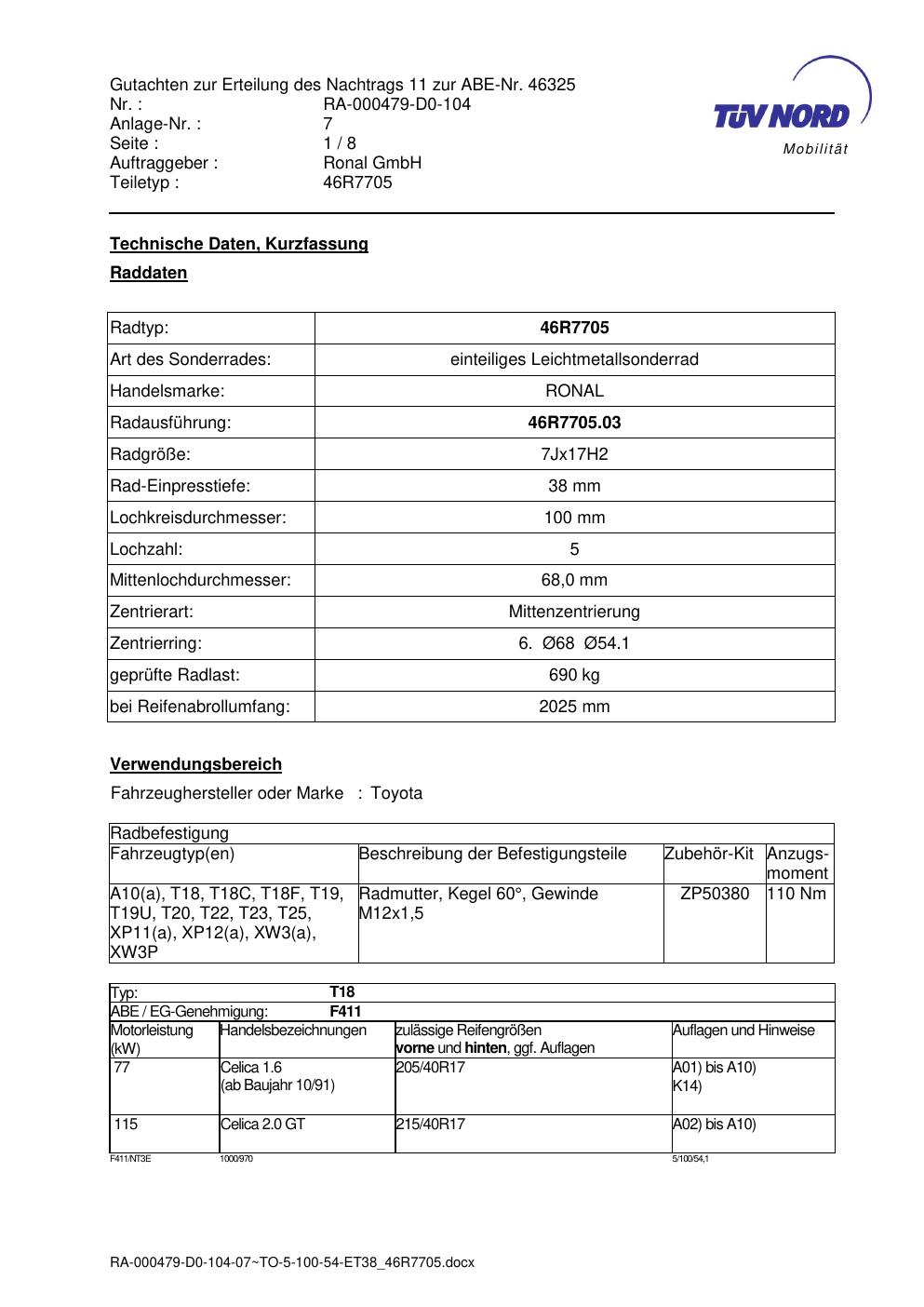 Dieses Gutachten (abe) bezieht sich auf die Alufelge Ronal 46R7705 in der Ausführung 7Jx17 ET 0, Mittenloch 0 mm (KBA 46325). Im PDF findest du typischerweise zulässige Reifengrößen, Auflagen/Anbauhinweise und – je nach Dokument – Hinweise zur Eintragung.