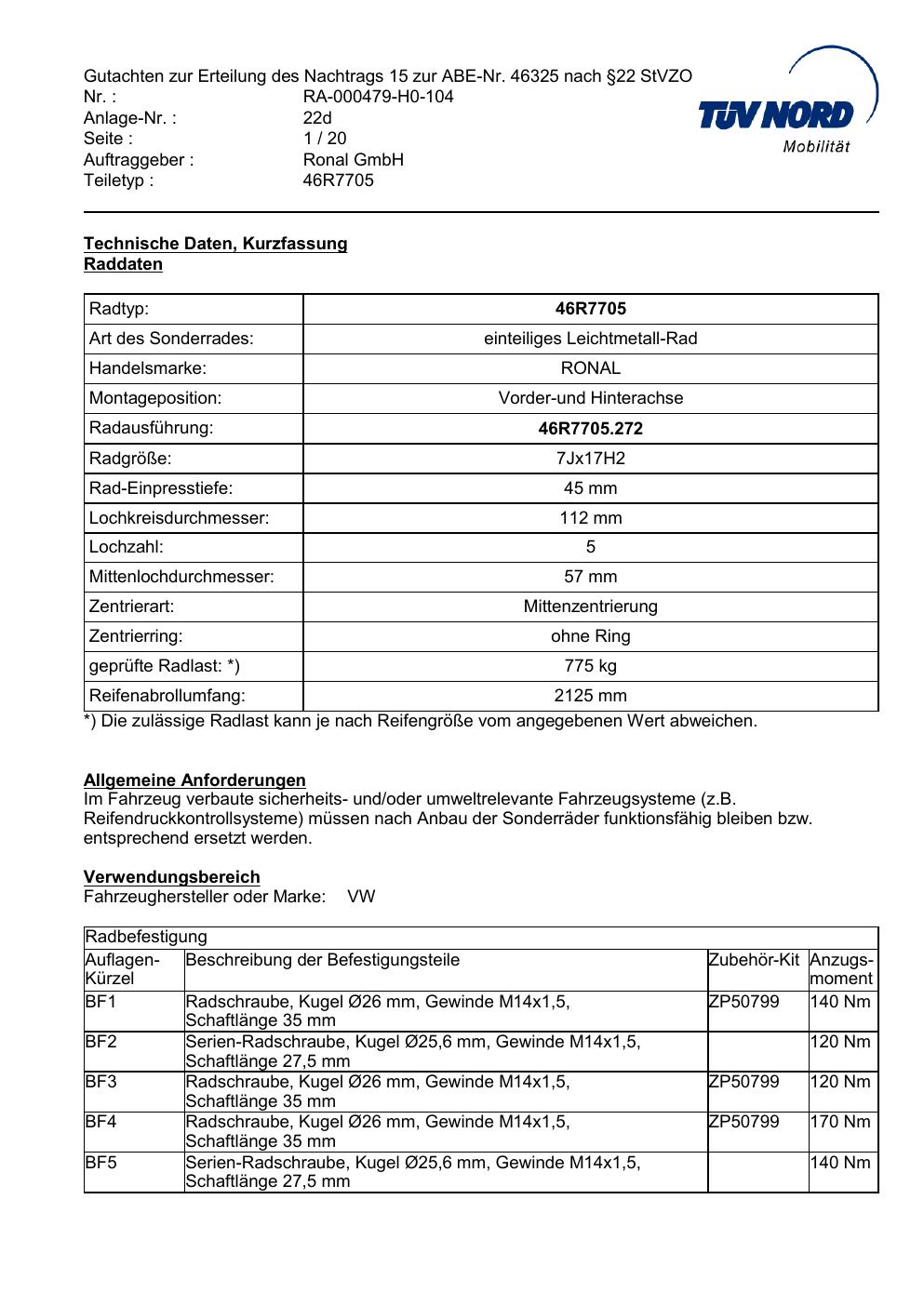Dieses Gutachten (abe) bezieht sich auf die Alufelge Ronal 46R7705 in der Ausführung 7Jx17 ET 0, Mittenloch 0 mm (KBA 46325). Im PDF findest du typischerweise zulässige Reifengrößen, Auflagen/Anbauhinweise und – je nach Dokument – Hinweise zur Eintragung.