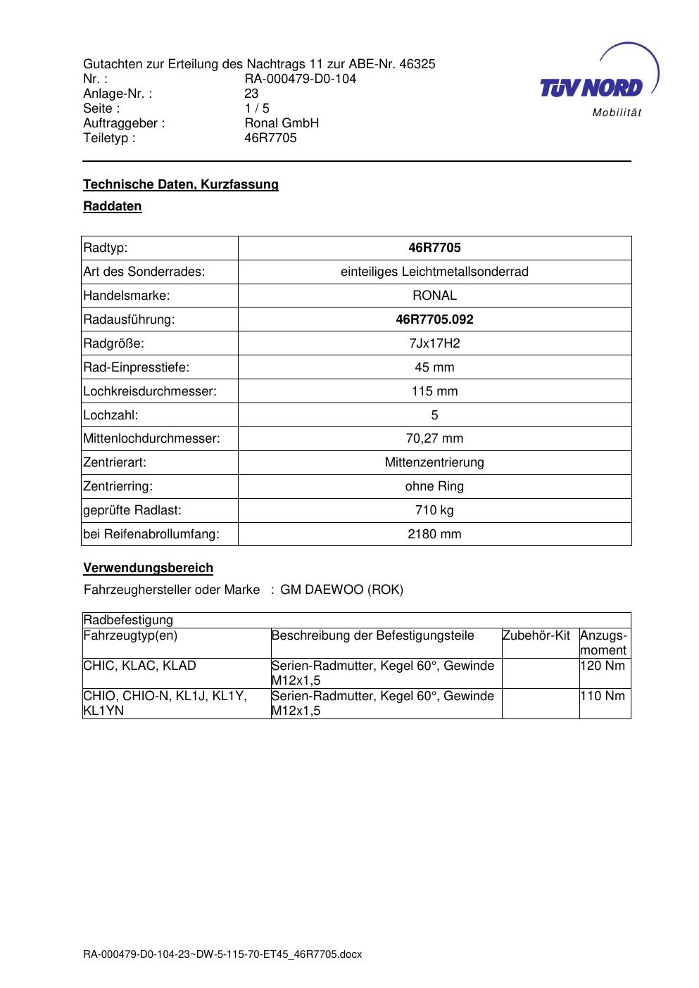Dieses Gutachten (abe) bezieht sich auf die Alufelge Ronal 46R7705 in der Ausführung 7Jx17 ET 0, Mittenloch 0 mm (KBA 46325). Im PDF findest du typischerweise zulässige Reifengrößen, Auflagen/Anbauhinweise und – je nach Dokument – Hinweise zur Eintragung.