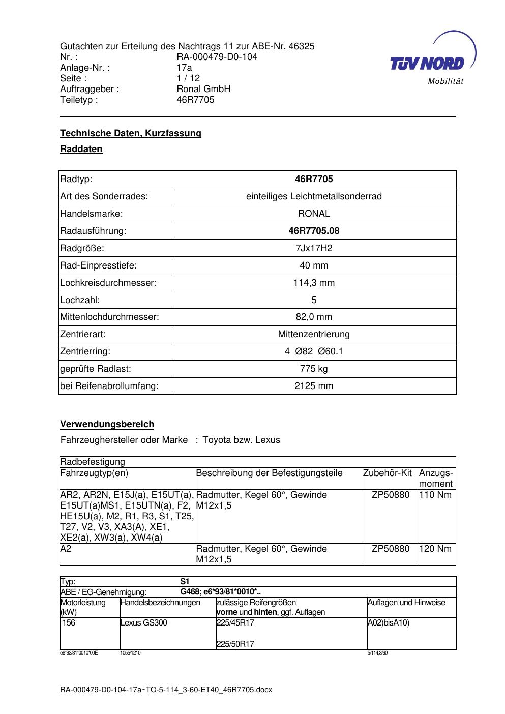 Dieses Gutachten (abe) bezieht sich auf die Alufelge Ronal 46R7705 in der Ausführung 7Jx17 ET 0, Mittenloch 0 mm (KBA 46325). Im PDF findest du typischerweise zulässige Reifengrößen, Auflagen/Anbauhinweise und – je nach Dokument – Hinweise zur Eintragung.