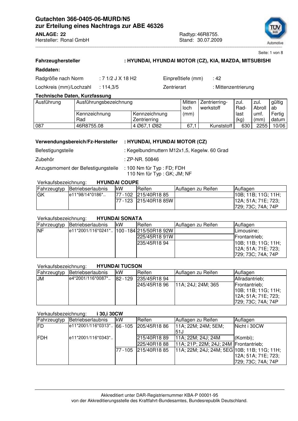 Dieses Gutachten (abe) bezieht sich auf die Alufelge Ronal 46R8755 in der Ausführung 2Jx18 ET 0, Mittenloch 0 mm (KBA 46326). Im PDF findest du typischerweise zulässige Reifengrößen, Auflagen/Anbauhinweise und – je nach Dokument – Hinweise zur Eintragung.