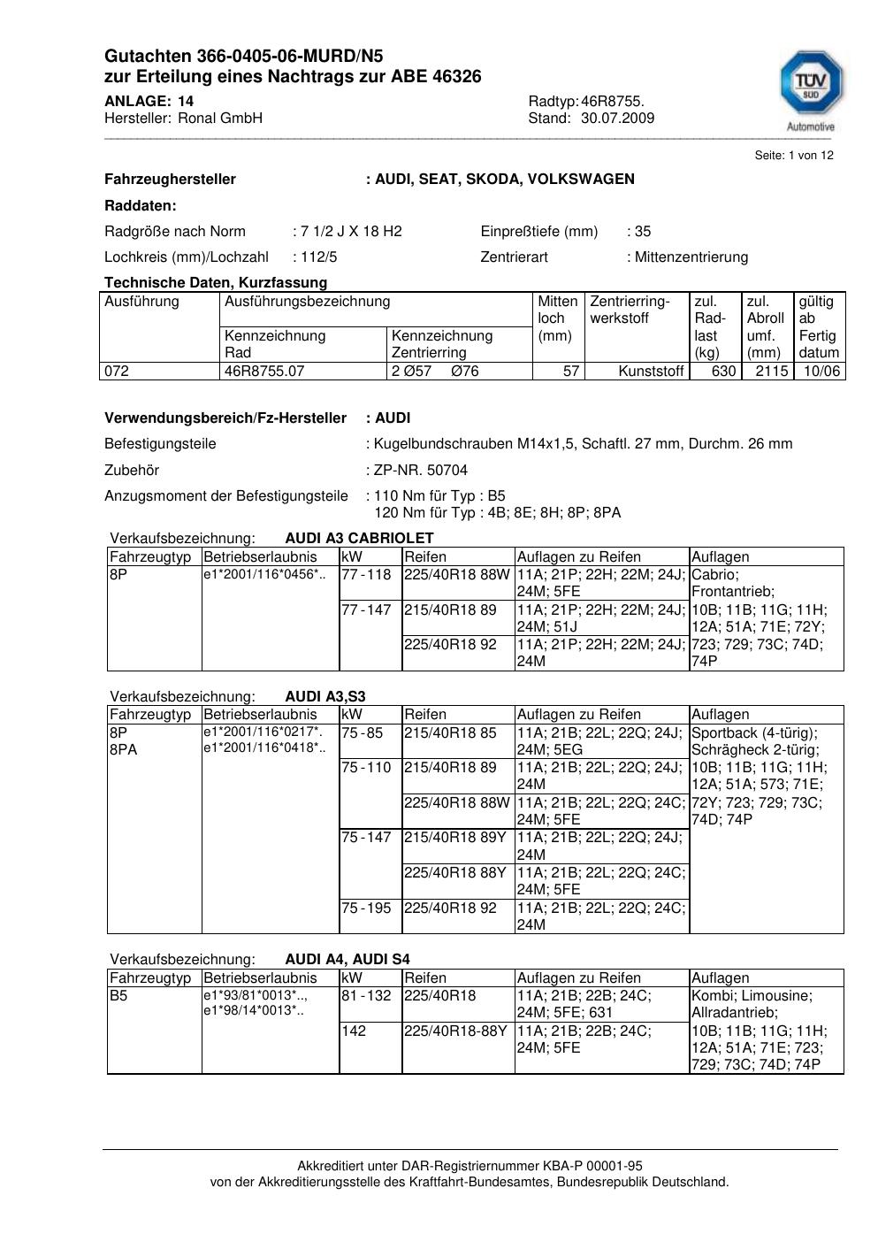 Dieses Gutachten (abe) bezieht sich auf die Alufelge Ronal 46R8755 in der Ausführung 2Jx18 ET 0, Mittenloch 0 mm (KBA 46326). Im PDF findest du typischerweise zulässige Reifengrößen, Auflagen/Anbauhinweise und – je nach Dokument – Hinweise zur Eintragung.