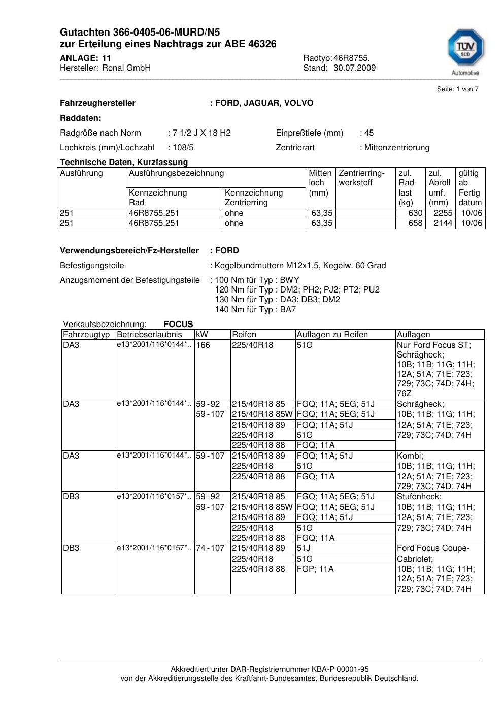Dieses Gutachten (abe) bezieht sich auf die Alufelge Ronal 46R8755 in der Ausführung 2Jx18 ET 0, Mittenloch 0 mm (KBA 46326). Im PDF findest du typischerweise zulässige Reifengrößen, Auflagen/Anbauhinweise und – je nach Dokument – Hinweise zur Eintragung.