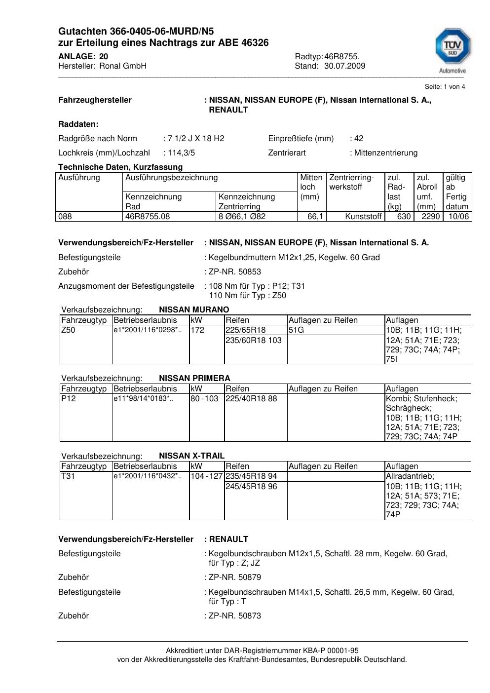 Dieses Gutachten (abe) bezieht sich auf die Alufelge Ronal 46R8755 in der Ausführung 2Jx18 ET 0, Mittenloch 0 mm (KBA 46326). Im PDF findest du typischerweise zulässige Reifengrößen, Auflagen/Anbauhinweise und – je nach Dokument – Hinweise zur Eintragung.