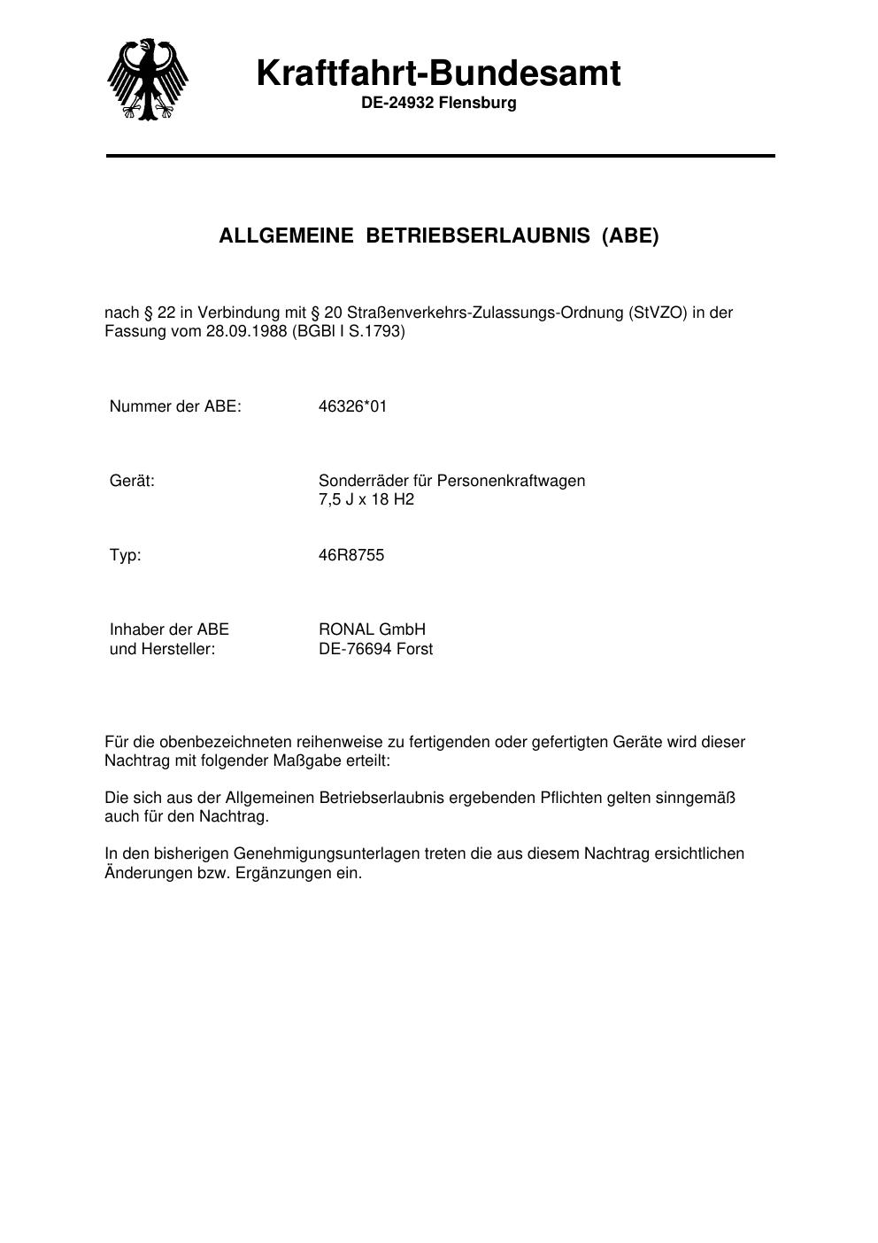 Dieses Gutachten (abe) bezieht sich auf die Alufelge Ronal 46R8755 in der Ausführung 7.5Jx18 ET 0, Mittenloch 0 mm (KBA 46326). Im PDF findest du typischerweise zulässige Reifengrößen, Auflagen/Anbauhinweise und – je nach Dokument – Hinweise zur Eintragung.