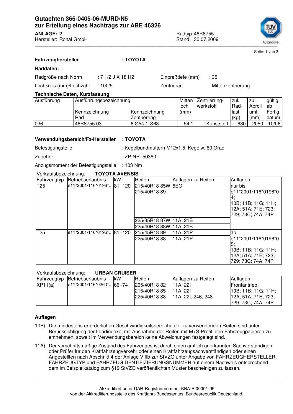 Dieses Gutachten (abe) bezieht sich auf die Alufelge Ronal 46R8755 in der Ausführung 2Jx18 ET 0, Mittenloch 0 mm (KBA 46326). Im PDF findest du typischerweise zulässige Reifengrößen, Auflagen/Anbauhinweise und – je nach Dokument – Hinweise zur Eintragung.