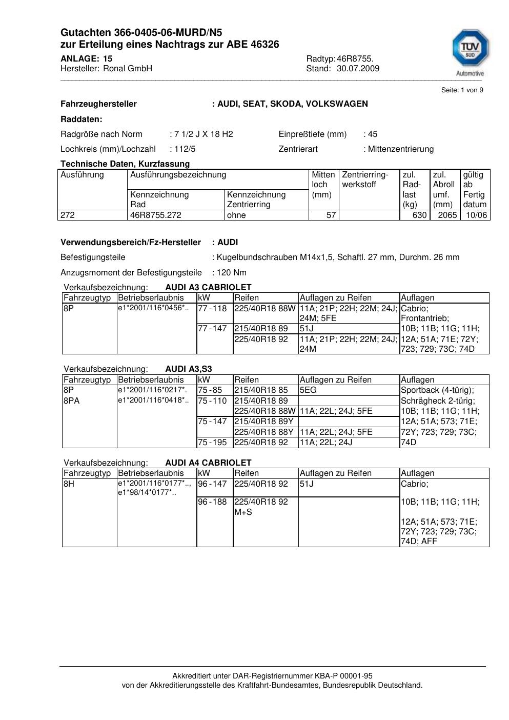 Dieses Gutachten (abe) bezieht sich auf die Alufelge Ronal 46R8755 in der Ausführung 2Jx18 ET 0, Mittenloch 0 mm (KBA 46326). Im PDF findest du typischerweise zulässige Reifengrößen, Auflagen/Anbauhinweise und – je nach Dokument – Hinweise zur Eintragung.