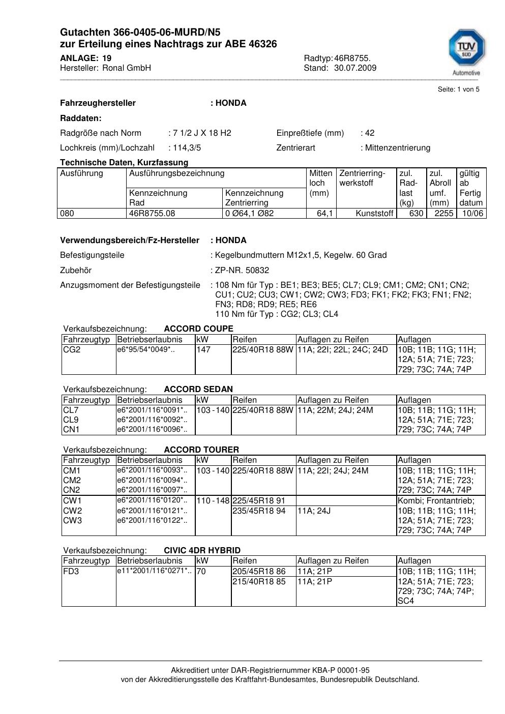 Dieses Gutachten (abe) bezieht sich auf die Alufelge Ronal 46R8755 in der Ausführung 2Jx18 ET 0, Mittenloch 0 mm (KBA 46326). Im PDF findest du typischerweise zulässige Reifengrößen, Auflagen/Anbauhinweise und – je nach Dokument – Hinweise zur Eintragung.