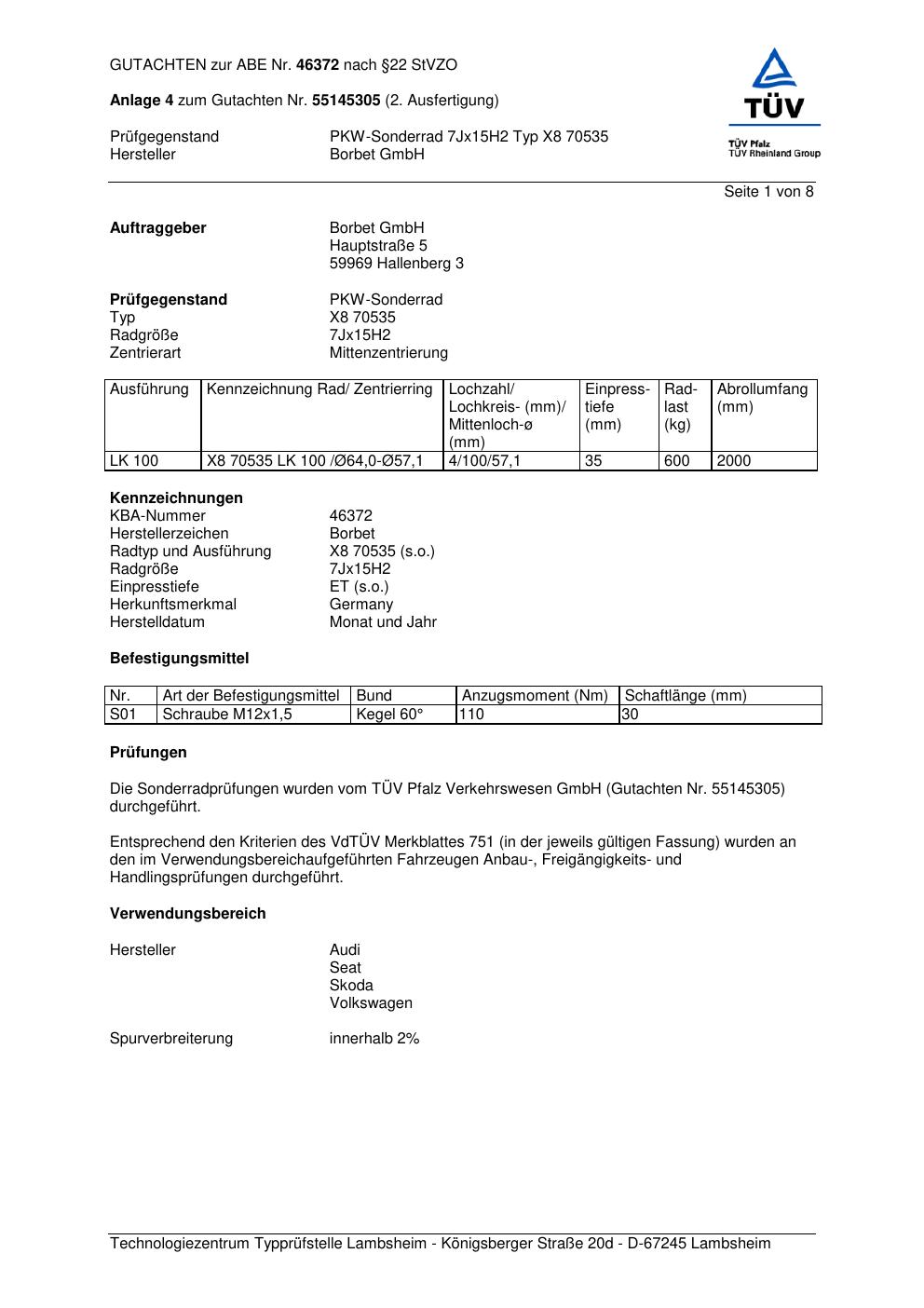 Dieses Gutachten (abe) bezieht sich auf die Alufelge Borbet X8 70535 in der Ausführung 7Jx15 ET 0, Mittenloch 0 mm (KBA 46372). Im PDF findest du typischerweise zulässige Reifengrößen, Auflagen/Anbauhinweise und – je nach Dokument – Hinweise zur Eintragung.