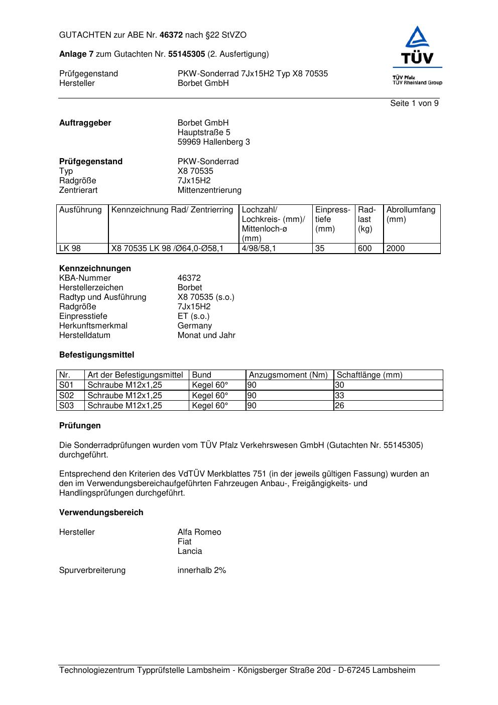 Dieses Gutachten (abe) bezieht sich auf die Alufelge Borbet X8 70535 in der Ausführung 7Jx15 ET 0, Mittenloch 0 mm (KBA 46372). Im PDF findest du typischerweise zulässige Reifengrößen, Auflagen/Anbauhinweise und – je nach Dokument – Hinweise zur Eintragung.